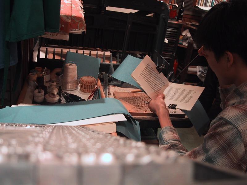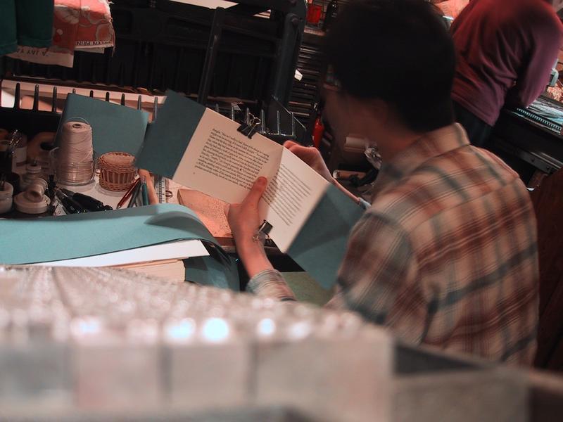 Here I am finishing up a batch of books, the last four copies of Brad & Amy, which I presented to a friend at his wedding in October. These copies are going an old mentor of mine and the author. Here the thread is being led through the center-hole. | |