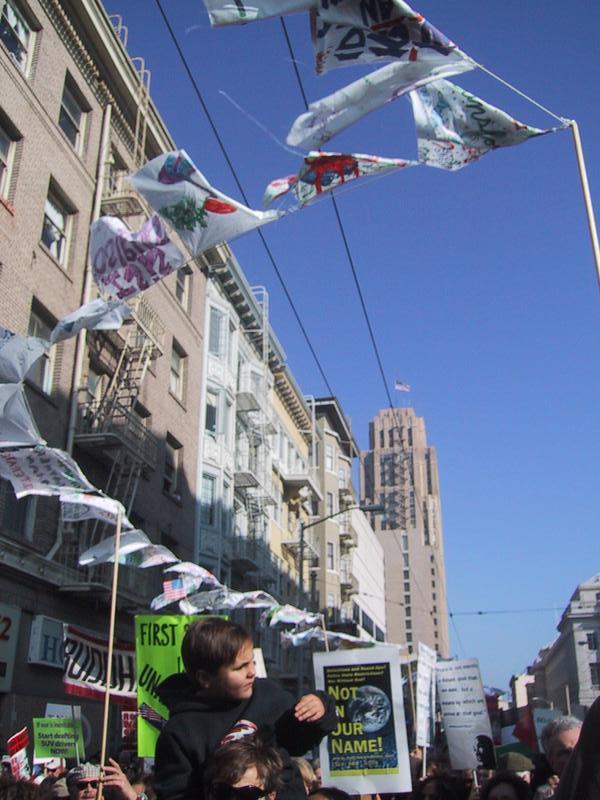 Some people created trains of small prayer-like flags. Kids sat on their parent's shoulders. At this point, the crowd is approaching Civic Center, which was absolutely packed.