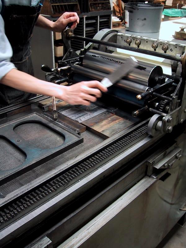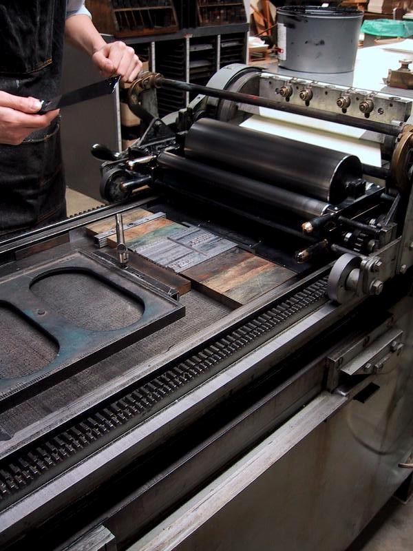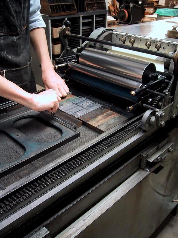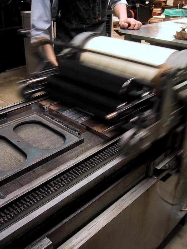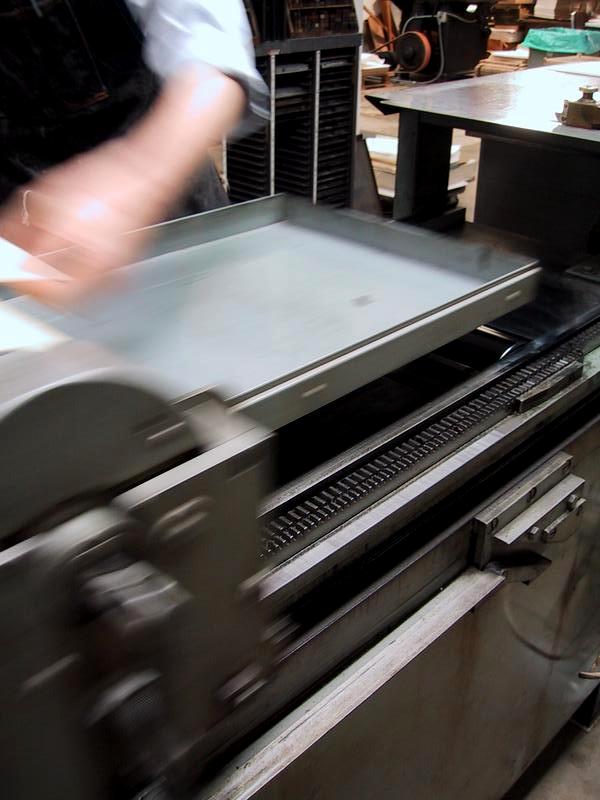 Operating the Vandercook SP-15. I am in the process of grabbing the printed sheet from the cylinder. | |