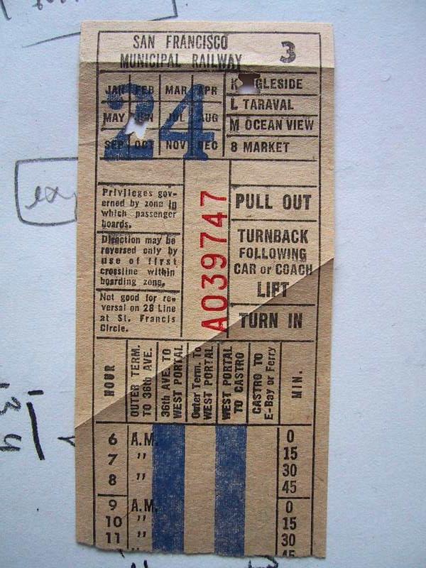 A San Francisco Municipal Railway (MUNI) transfer from the mid 70's. The 8 Market line, an electric trolleybus route, has been replaced by vintage streetcar service in the guise of the F Market line. |
