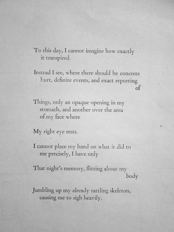 Fragment of a poem by A-M, to accompany photograph from same. 18pt Van Dijck, on 24pica lines (approximately 4 inches)... |