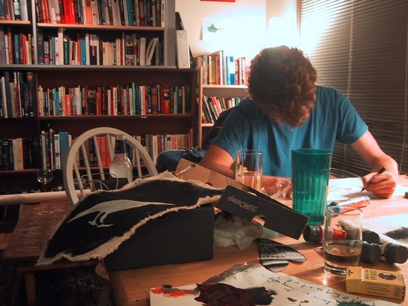 Michael Warner with pen, Micah's crow print in the foreground. | |