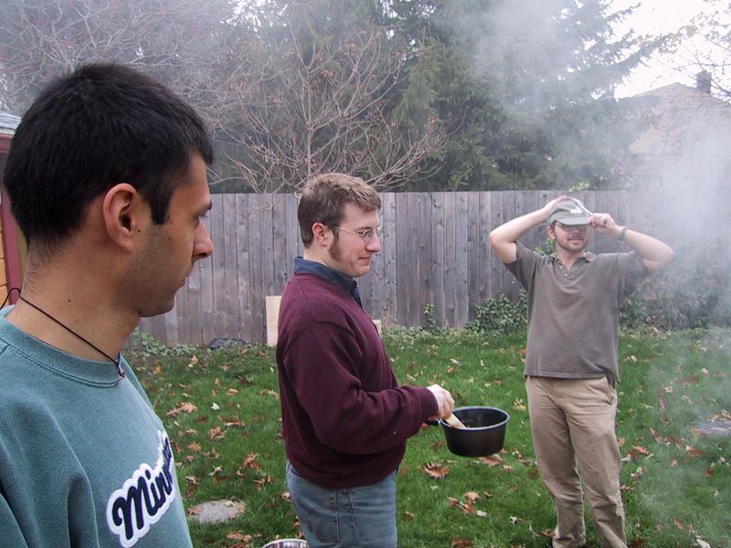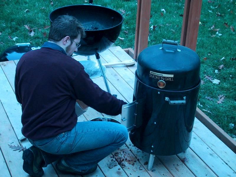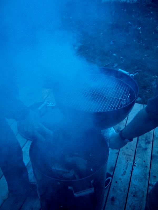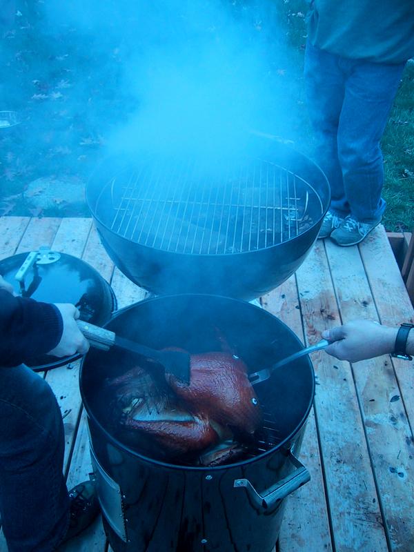 Mike and Jamie, smoke, and basting, with the bird on the grill. | |