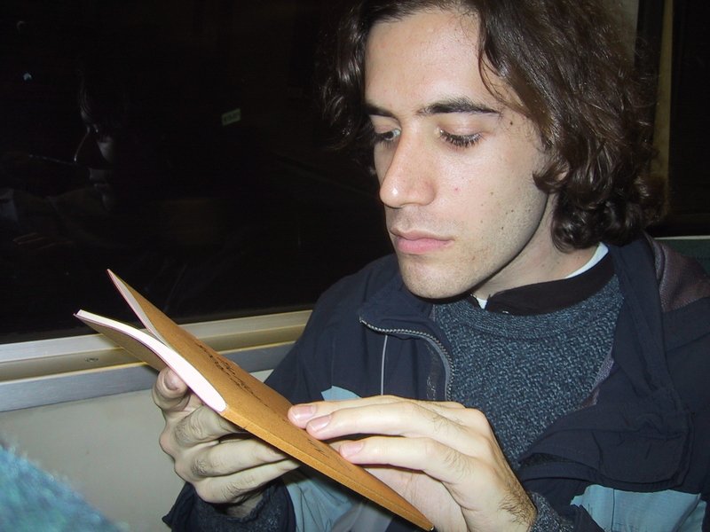 You know, riding public transit is a great way to read. Here Michael picks up a copy of Fred Lee's My Day at The Beach / The High Rise. |