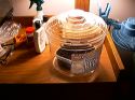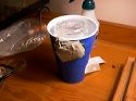 Place the cricket food in the dish of choice and place it in the big Tupperware container like shown. Put the water feeder in like shown. Your habitat is now complete! |