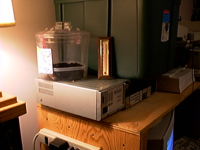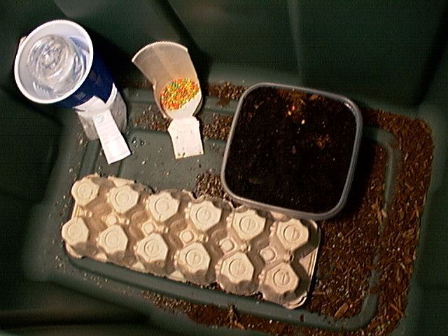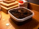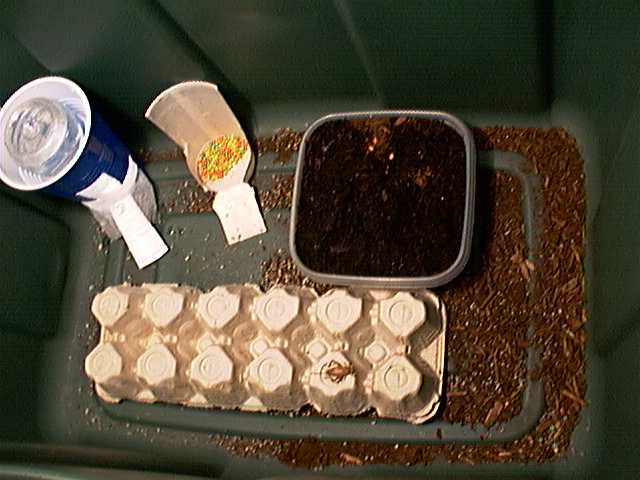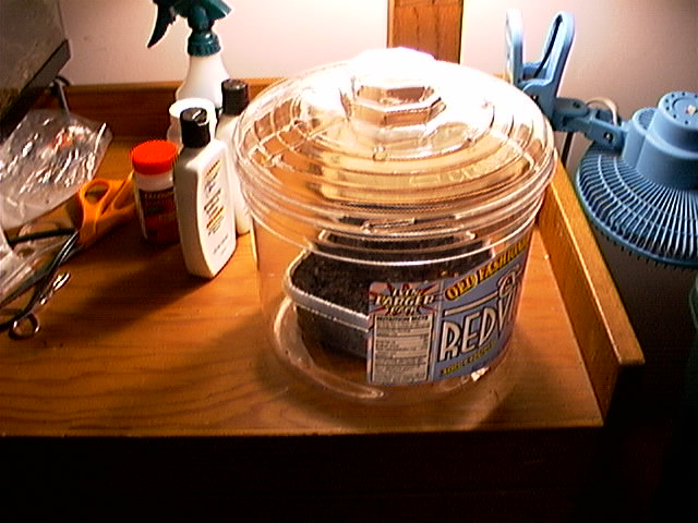 Setting up the breeding dish:Take one of the Zip Lock plastic Tupperware containers and fill it up with dirt. I went into the back yard and scooped up some bark dust. I have had problems using some potting soils. Some of them have anti-insect chemicals in them. I would reccomend using some form of Turf Substrate that you can get at pet stores. It usually comes compressed into about the size of a brick, you add water and it expands into dirtlike brown stuff. The good thing about this is that it is designed with your pets in mind and will produce consistant results. It says on it that the pet can eat it without harm, which is good! Fill the container with water until you can see that half of the dirt is saturated. You will see the water line on the side, it will be about ½ inch deep.