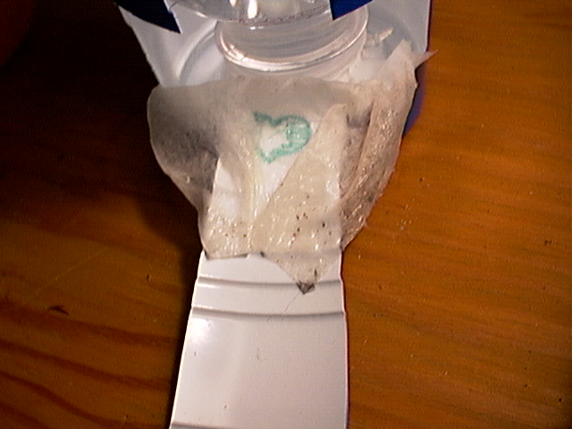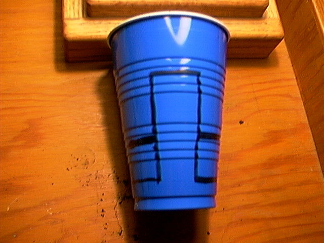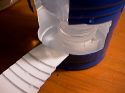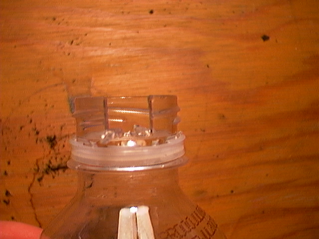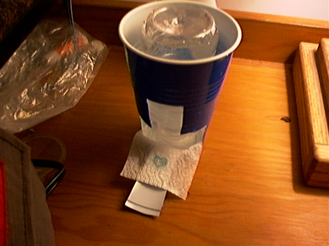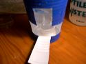 Bend out the flaps created. This provides a ramp for the Crickets to get to the water. Cut a notch in the bottled water container about ¼ inch deep like in the picture. Fill the water bottle with water and put the cup on it. Turn the whole think upside down and the water will fill the bottom of the cup to a shallow level. Take some cotton balls or roll up a paper towel and press it into the bottom of the cup. There shouldn't be a pool of water accessable to the babies. The towel will get moist and the crickets will be able to suck on the paper or cotton like wet washcloth. Take a piece of Duct Tape and place it on the side of the