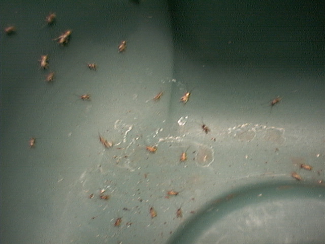 This page describes a method of raising the standard house cricket available at any pet store. I took pictures of just about every step in the cricket raising process. I have found several resources on how to raise crickets and I have had mixed results from what I gathered. The most important facts that I have learned from experience are: A. Crickets need warmth. If you are having problems raising crickets to feed your amphibians or reptiles, or if you are just interested in starting from scratch, give this method a try! |