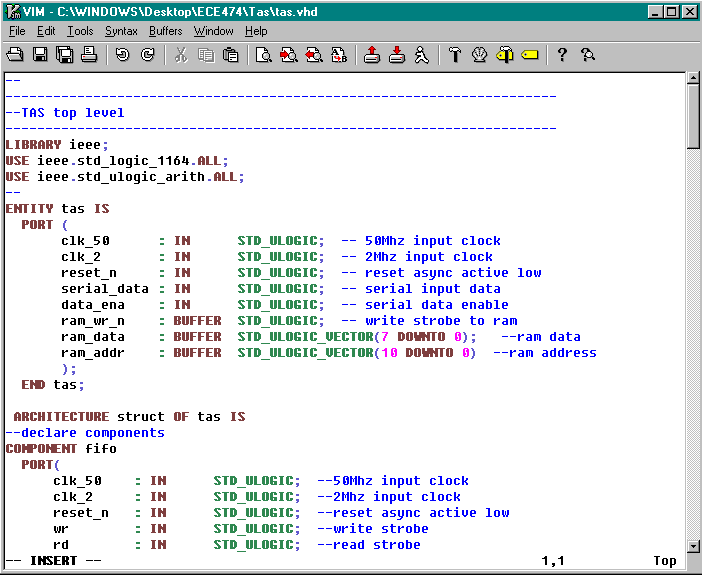 Windows 9x After you get these two files, your going to want to unzip these files in the same place. Then run the install file to set up vim and add a quick link to your right mouse button menu if you want etc.. You can also have text highlighting which is very nice for vhdl, you can see which words are key words etc... There will be a tutor diectory in the main vim directory that the zip file creates. Run the tutorial and you will learn all the basics to vim and vi!! Images: